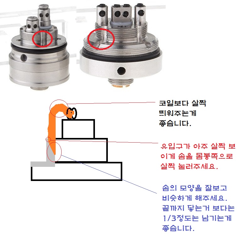 코일에 솜끼우고 액상 유입구 방향으로 쭉 내린뒤에 사진에 보이는 나사산쪽으로 딱 붙여서 세로로 가위질 하시면 됩니다