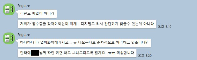 인그레이즈 측과의 대화내용을 보면 영수증이 디지탈로 되어있어서 간단하게 찾을수가 없다? 무슨 코드화 되어있는것도 아닐테고 도통 이해하기 힘든 내용입니다. 메일로 되어있는거라면 주문번호및 날짜로나마 검색이 될텐데...?