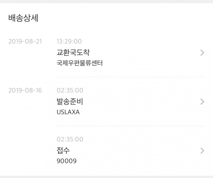 [EMS] 2019.08.21.13:29:00 국제우편물류센터 교환국도착 2019.08.16.02:35:00 USLAXA 발송준비 2019.08.16.02:35:00 90009 접수 [USPS] 전 https://www.17track.net/ko 에서 조회했습니다 2019-08-21 13:29 KOREA REPUBLIC OF, Processed Through Facility -> Your item was processed through a facility in KOREA REPUBLIC OF on August 21, 2019 at 1:29 pm. The item is currently in transit to the destination. 2019-08-21 03:30 KOREA REPUBLIC OF, Customs Clearance 2019-08-21 03:17 KOREA REPUBLIC OF, INCHEON, Departed |