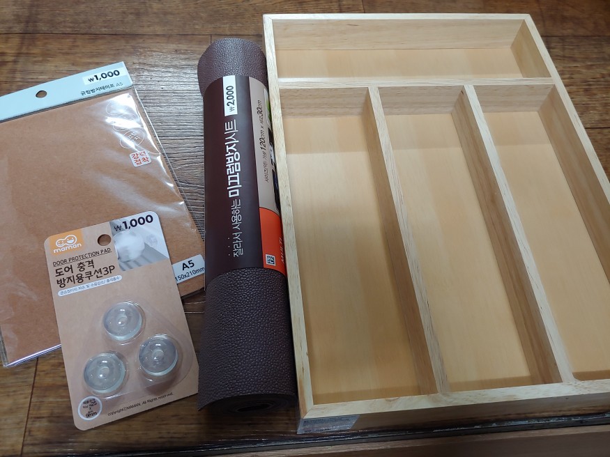 뭔가 이대로 쓰기엔 별로여서 미끄럼방지시트 사고, 도어방지쿠션사고, 긁힘방지테이프도 샀어요.