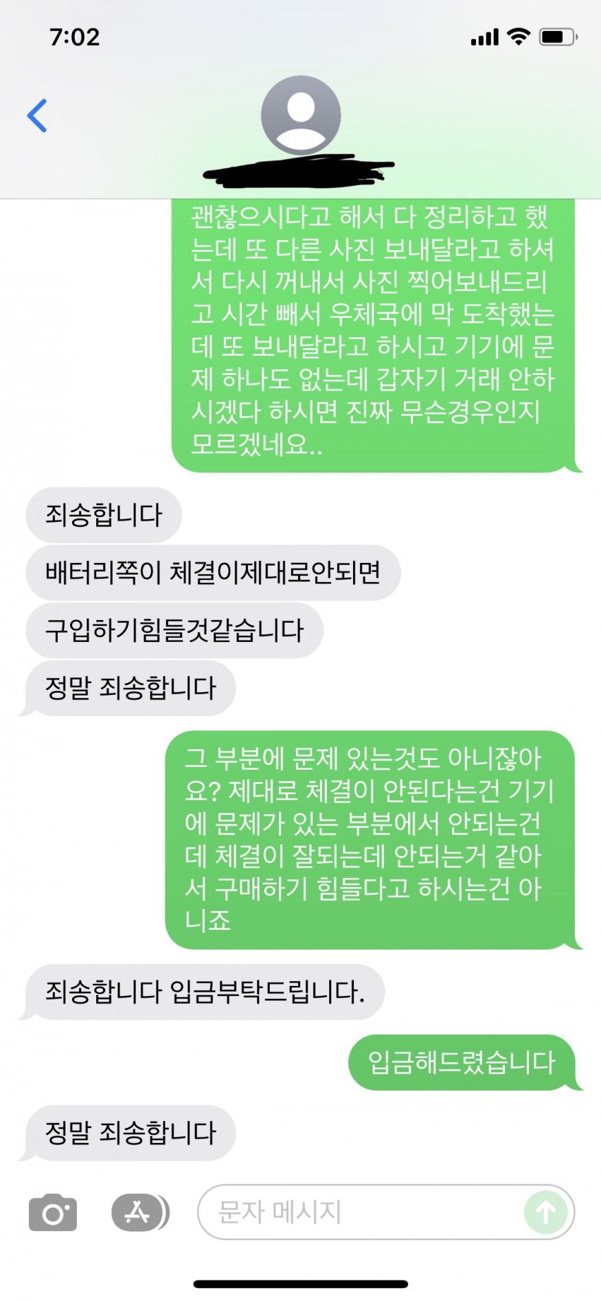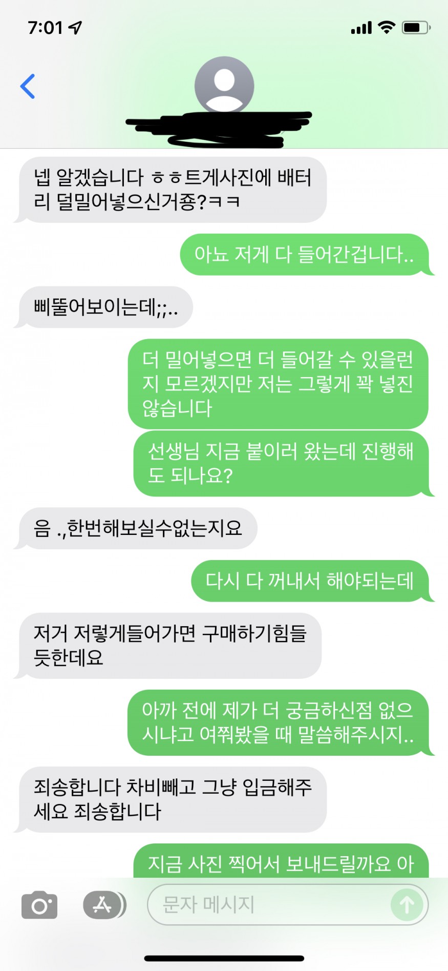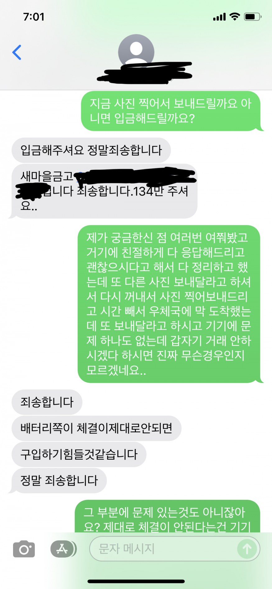 궁금한점 다 말씀드리고 구매하신다 하여 제품을 동봉하는 와중에 사진, 동영상 요청에 다시 꺼내서 사진을 보내드렸으며 다시 동봉하고 붙이러 가는 길에 또 사진을 요청하셔서 다시 회사에 가서 꺼내어 사진을 보내드렸습니다. 여기까진 괜찮습니다. 금액이 크다보니 신중한게 당연한거니까요. 근데 제품상태에 대해서 트집을 계속 잡았습니다.