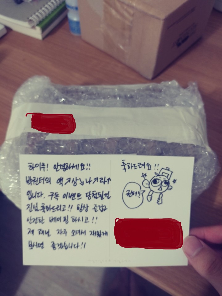 택배를 받고 사실 더 기분이 좋았던건 박권터님의 자필카드! 처음엔 주방용품그려져있길래 이건뭐지했는데.. 뚜둔!!