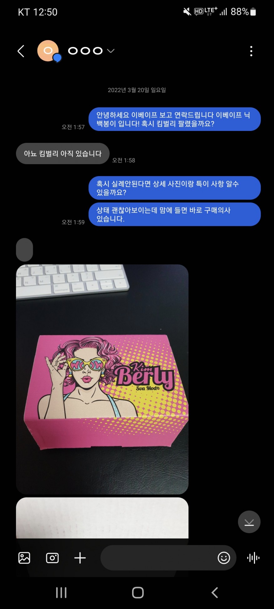 3월 20일 스바킴벌리 제품 판매글을 보고 판매자에게 연락 함.