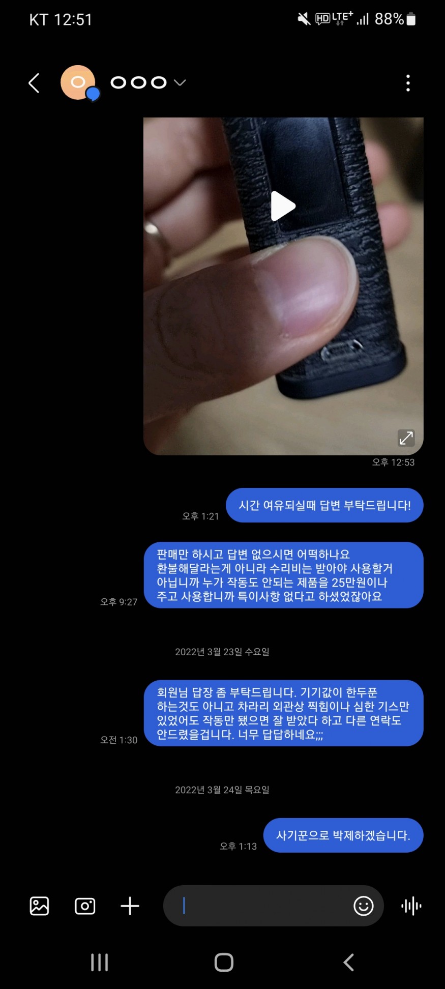 처음부터 막 말을 한 것도 아닙니다. 판매자 입장에선 정상 제품을 보냈는데 배송중 문제로 망가졌을 수도 있고 다짜고짜 환불 해달라 하면 어쩌면 불쾌하실수도 있겠다 싶어 우선 정중하게 물어봤고 또 무조건 환불해달라는 것도 아니고 수리를 해서 쓰겠다는데도 (받을 때부터 전원이 안켜졌으니 환불 요구시엔 환불 받아 마땅하다 생각합니다) 이틀 뒤까지 아무런 답변이 없어 화가 나서 사기꾼으로 박제한다고 말했으나 아직 사이버수사대에는 접수는 안한 상태입니다.
