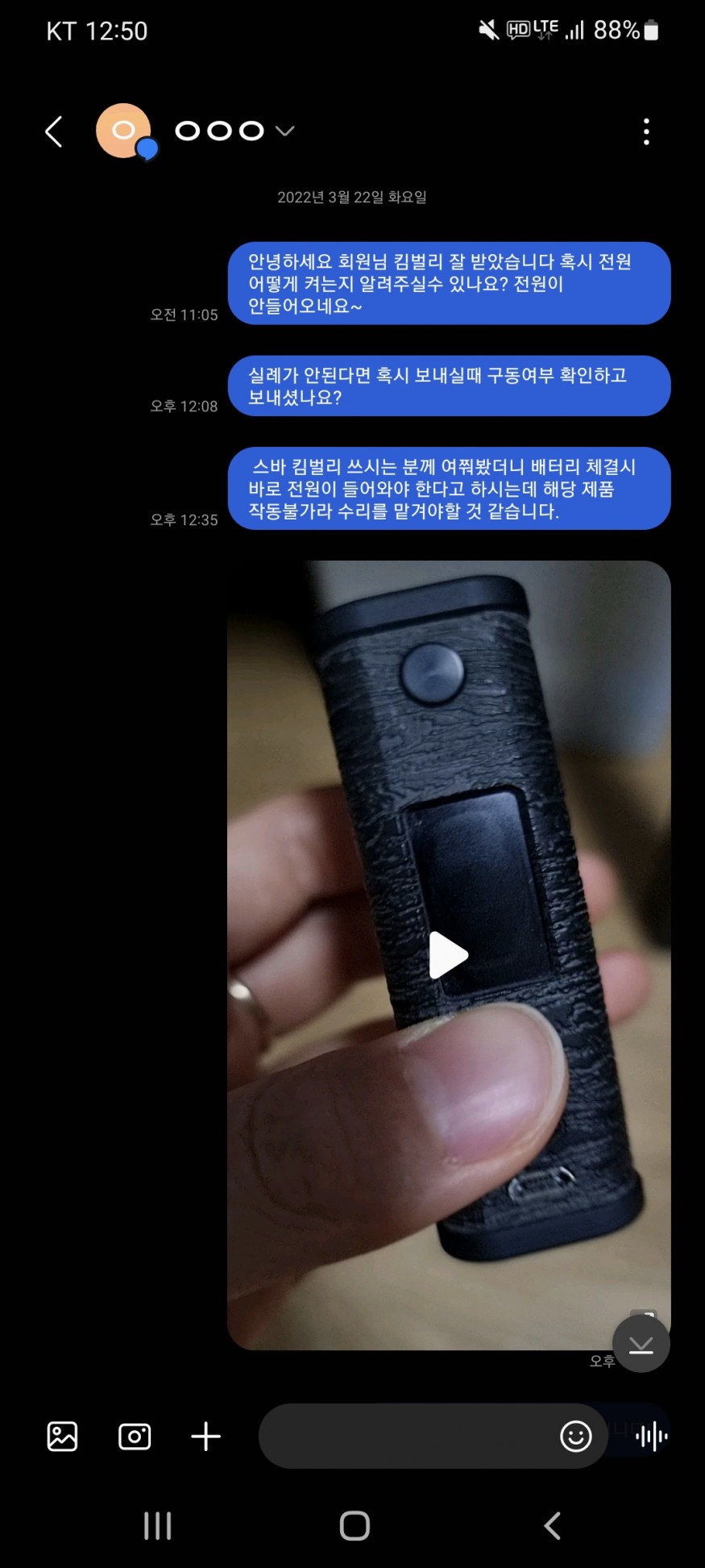 3월 22일 오전 제품 도착하여 확인 시 전원 안켜짐, 별 짓 다해도 안 켜져서 판매자에게 전원이 안켜진다고 문자 하였으나 답이 없어 전원 켜는 방법이 따로 있나 하여 스바킴벌리 보유중이신 익명의 모 회원님께 양해를 구하고 전원 켜는 방법 여쭙고 나니 배터리 체결시 자동으로 켜진다는 답을 듣고 받은 제품이 망가진 제품인걸 알게 됨. 제품 작동불가 동영상 촬영 후 판매자에게 배송 전 구동 확인 여부 물었으나 답 없음. 수리비 청구 또는 환불 관련 좋게 합의하려고 피드백 시도 문자 다시 보냄. 일주일 정도 지난 지금까지 계속 묵묵부답인 상태.