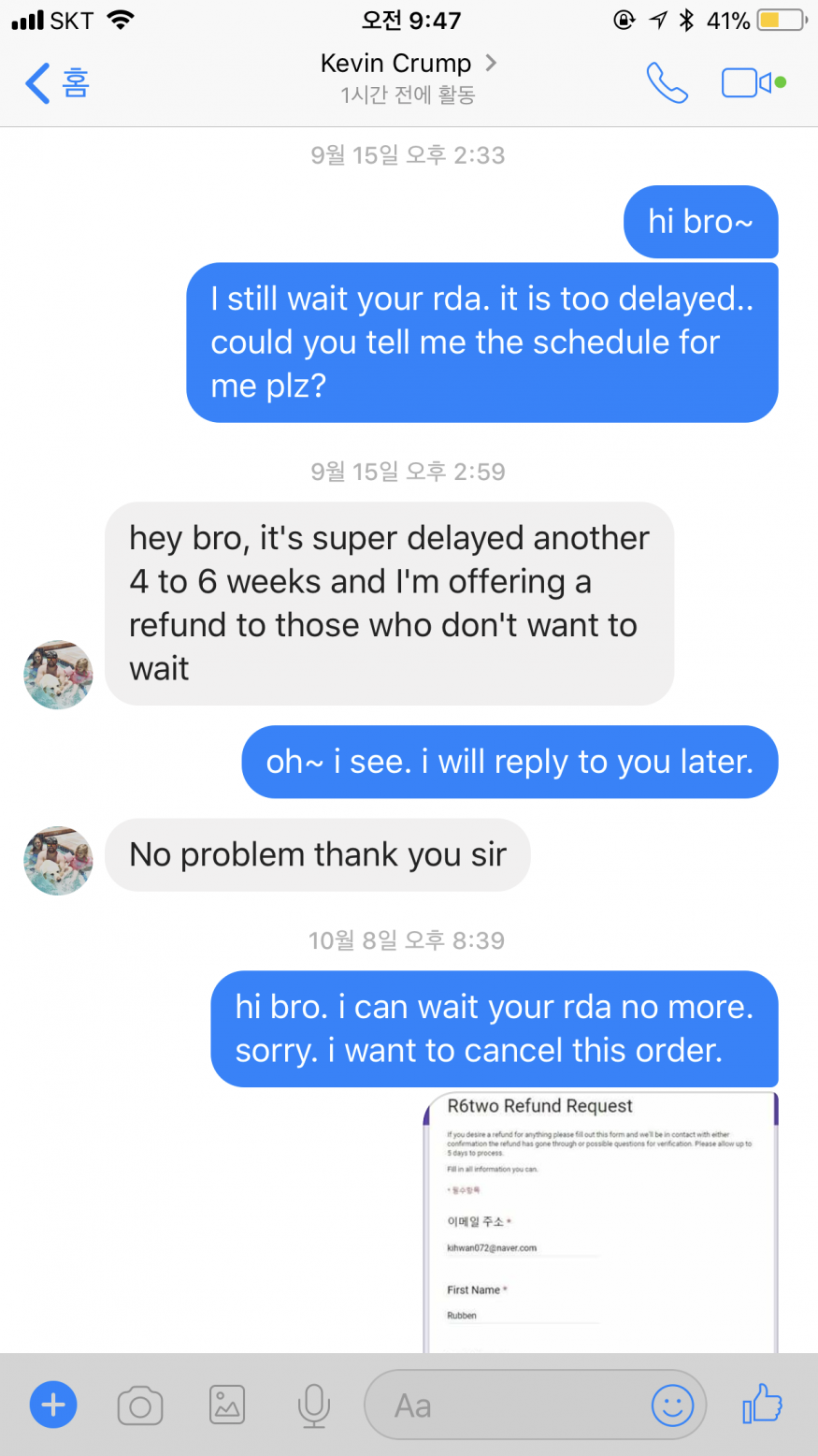 회원아이콘 와..저거 리스트 타신게 저리 되신겁니까? 쟤네 서비스 마인드 왜 저럴까요 ㄷㄷ 엄청나네요 케빈 ;; 저는 예전 뭐 2개 주문했다가 3달만인가에 리펀드 받았는데 사진보니까 685달러를 ㅋㅋ대화내용도그렇고 어이없네요