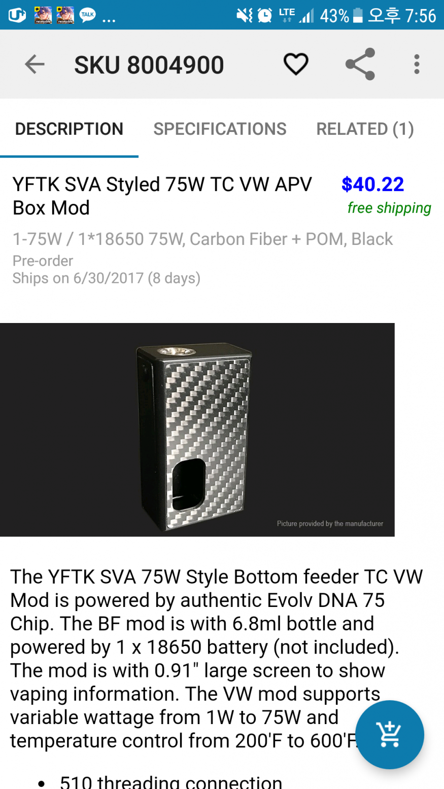 40불짜린 일반 멬 버전이고 위 설명과 다르게 사진상에 나온거 처럼 dna칩과 화면이 없습니다. https://www.fasttech.com/products/0/10036790/8004901-yftk-sva-styled-18650-mechanical-mod <ㅡ40불 https://www.fasttech.com/products/0/10035511/7753800-yftk-sva-styled-75w-tc-vw-apv-box-mod <ㅡ dna75 |