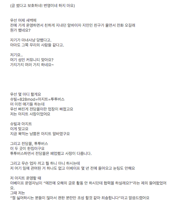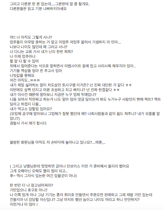 이거 몇분이서 쓰신걸 붙여서 그냥 올리신것같고, 어떤건 글씨크기도 안변했는데 갑자기 다른사람을 바뀐것처럼 서술하셨네요. 몇번을 읽었지만 아무런 설득력이 없는것 같습니다. 억울함이든 분함이든 정리가 된 내용으로 봤으면 좋겠네요. |