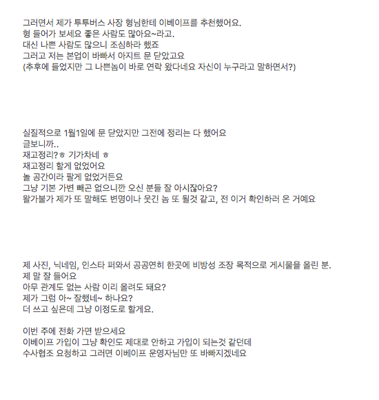 아 됐고 댓글이나 달아보세요 아니면 진짜 인보이스 올려보던가요 우리같은 이벺분들은 그 냠냠뿜뿜님땜에 뭐라한거에요 왜?? 아니인스타에 떡하니 친분이있는데 그러면 아 무조건 냠냠님이 혼자서 다해먹었을꺼야 이런생각으 누가합디까 그리고 브레드오씨나 슈빌 당신도 글싸지르고 잠수타지마세요 협박만 으리으리하게 올려놓고 아무런 피드백도없고 그러면 당연히 의심하는거 아닙니까? 그리고 저 글딱봐도 세분이서 할말 다써서 짜집기한거같은데 뭐 아니면말구요