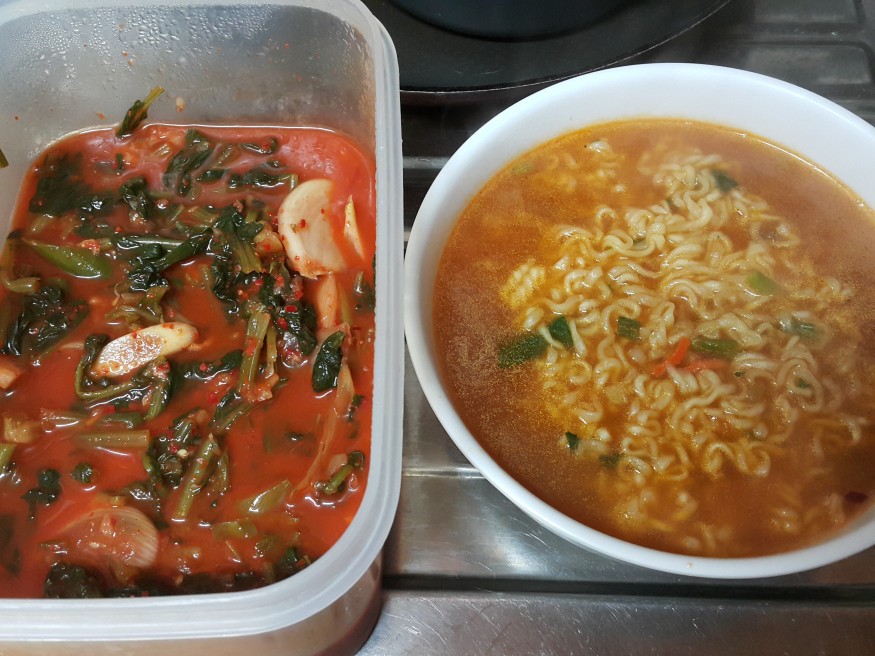 라면에 김치! 그건 한국인의 소울푸드죠! ㅠㅠ 라면 보니까 저도 먹고싶어져서 한개 끓이러 가야겠습니다! |