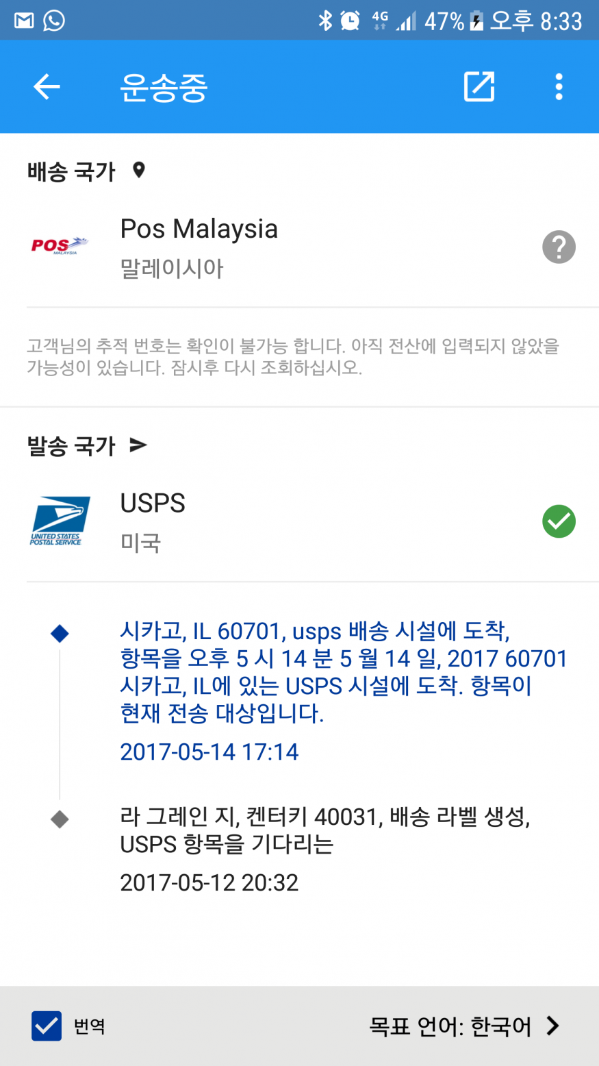 usps first class는 미국을 떠나면 조회가 안됩니다. 조회되는건 Priority Mail에용~ |