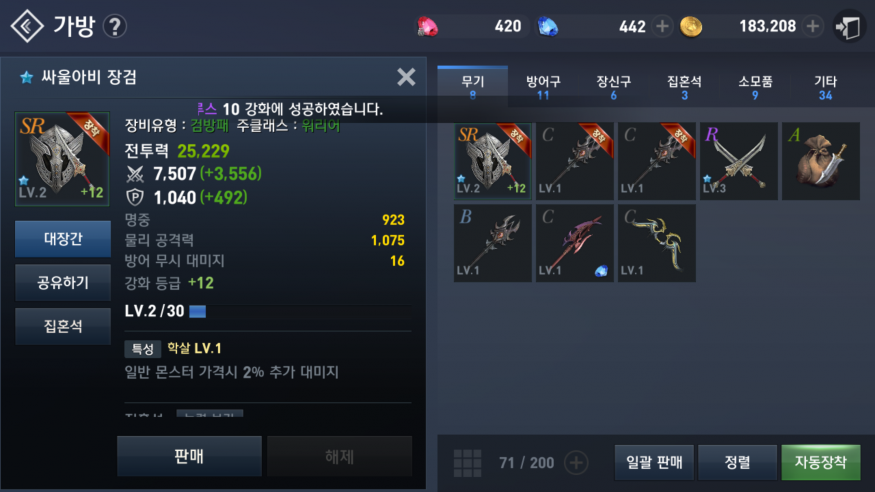 ㅋ ㅋ sr만들고 기분좋다고 9강무기에 축발랐는데 12강됐네요