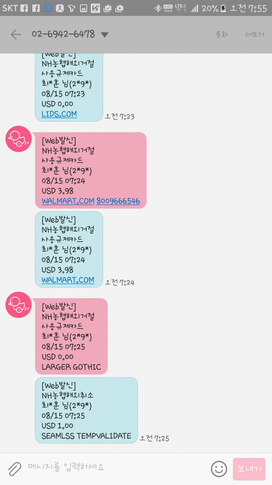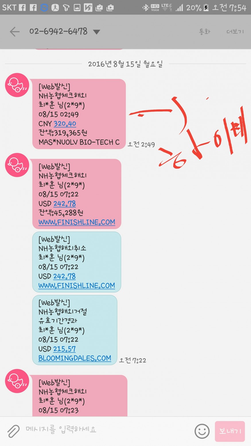 제목그대롭니다. 2시넘어서 결제한다음 7시 22부터부터 7시 25분까지 계솔 승인. 승인거절났습니다. 농협 사고예방센터에서도 연락이왔구요. 하이네 결제하지마세요. 전 피해본 금액이 약 27000원 정도입니다. 항상 비자 체크카드 이거하나로 하이네만! 딱 하이네만 해외결제합니다.