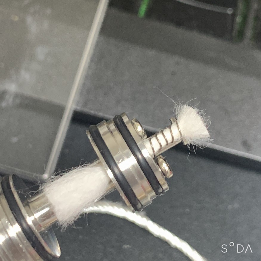 하부 액상쪽은 짧게 치고 펼쳐주시면 됩니다. 흡입할때 자연적으로 기울어져서 생각보다 잘 올라와요. (1~2mm 길이정도 남기고 잘라줍니다.) 와이어는 32짜리 쓰는데 요건 좀 손을 타구요. 30짜리면 어느정도 괜찮으실꺼예요. 가느다란 와이어로 고옴(1.2~2)셋팅으로 낮은와트에서 사용했을때 은은하니 향이 조화로와 지더군요. 연무는 확줄어들지만요. (솜길이는 코일끝부터 액상탱크입구 길이에 두배로하고 절반을 꼬와서 탱크입구로 넣어서 코일쪽으로 빼주고 커팅합니다. 개인적인 방법이니 참고만하세요) |