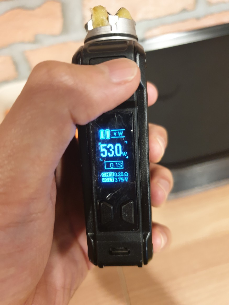 옴은 0.26 볼트는 3.75볼트 나오게 와티즈를53와트로 베이핑 하였습니다..