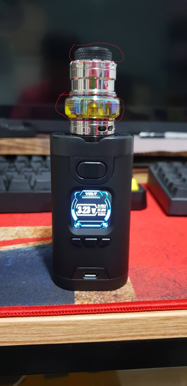 아.. 혹시 만타탱크.. 그 rta 보신거 아니신지.. 제껀 기성코일쓰는 만타탱크고 동그라미부분 드립팁은 깨져서 다른제품이고, 밑에 경통은 첨에 있는 레진 뱀무늬?같은게 액상이 잘 안보여서 같이 들어있는 일반 유리경통으로 바꾼겁니다ㅎ |