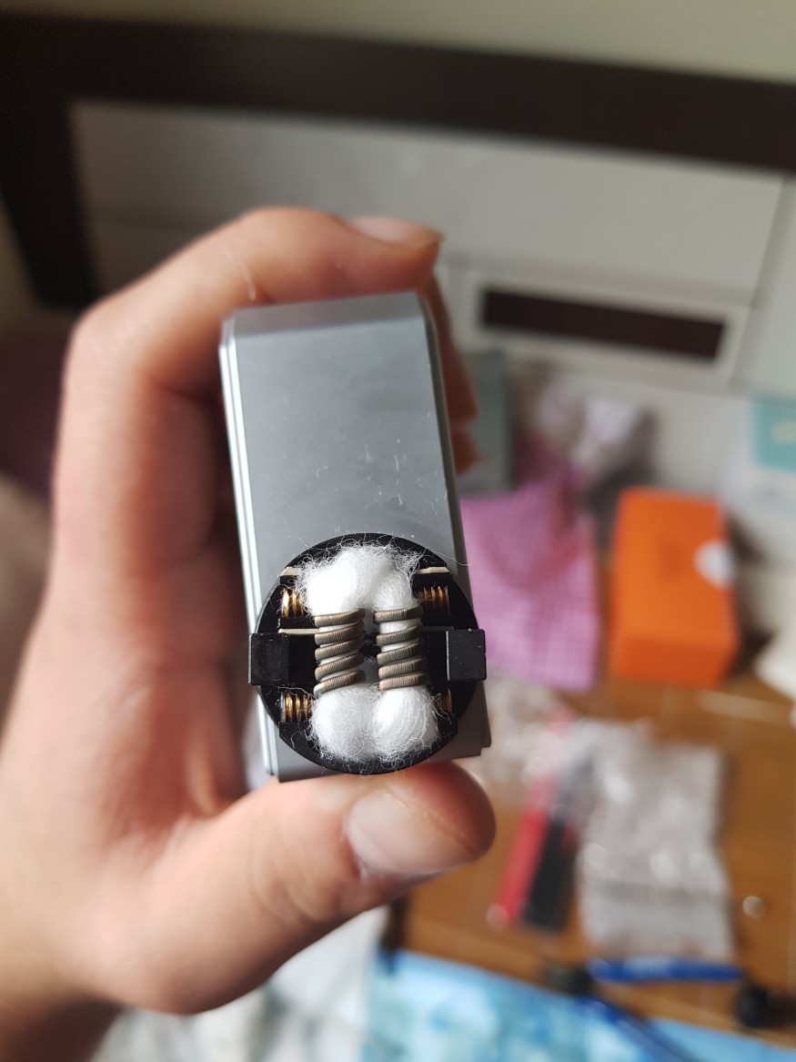 액상 좀 튀실거예요 오른쪽 코일의 솜 양이 왼쪽보다 적군요 한쪽만 먼저 탈 겁니다 |