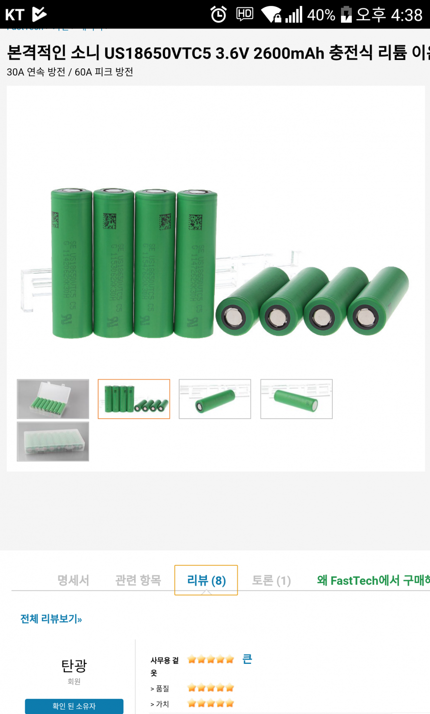 현재 VGOD PRO MECH 사용중입니다^^ 오늘사용하다가 파이어가 안되길래 배터리를 꺼내보니 첫번째 사진처럼 되어있더라고요 평소 +극을 아랫쪽에다가 사용했었거든요 근데 이게 언제 쇼트가 났었던건지;;; 그래서 반대로 +를 위로 향하게 넣고 파이어버튼을 누르니 또 잘되요^^;; 사진에 나와있는 배터리 사용해도 되는걸까요? 죄송하지만 질문을 하나더 드릴께요^^ 오늘 패텍을 다니다 배터리를 봤는데 소니18650 VTC5라는 배터리를 봤는데 저 배터리 미케니컬에 써도 되는건가요? 제가 쓰는건 소니18650 VTC5A 3.7v 25A 인데 쟤는 그냥 VTC5 3.6v 30A더라고요 저 제품 구매해도 되는걸까요? 가격도 8개의 5만원대면 저렴한거 같은데;;