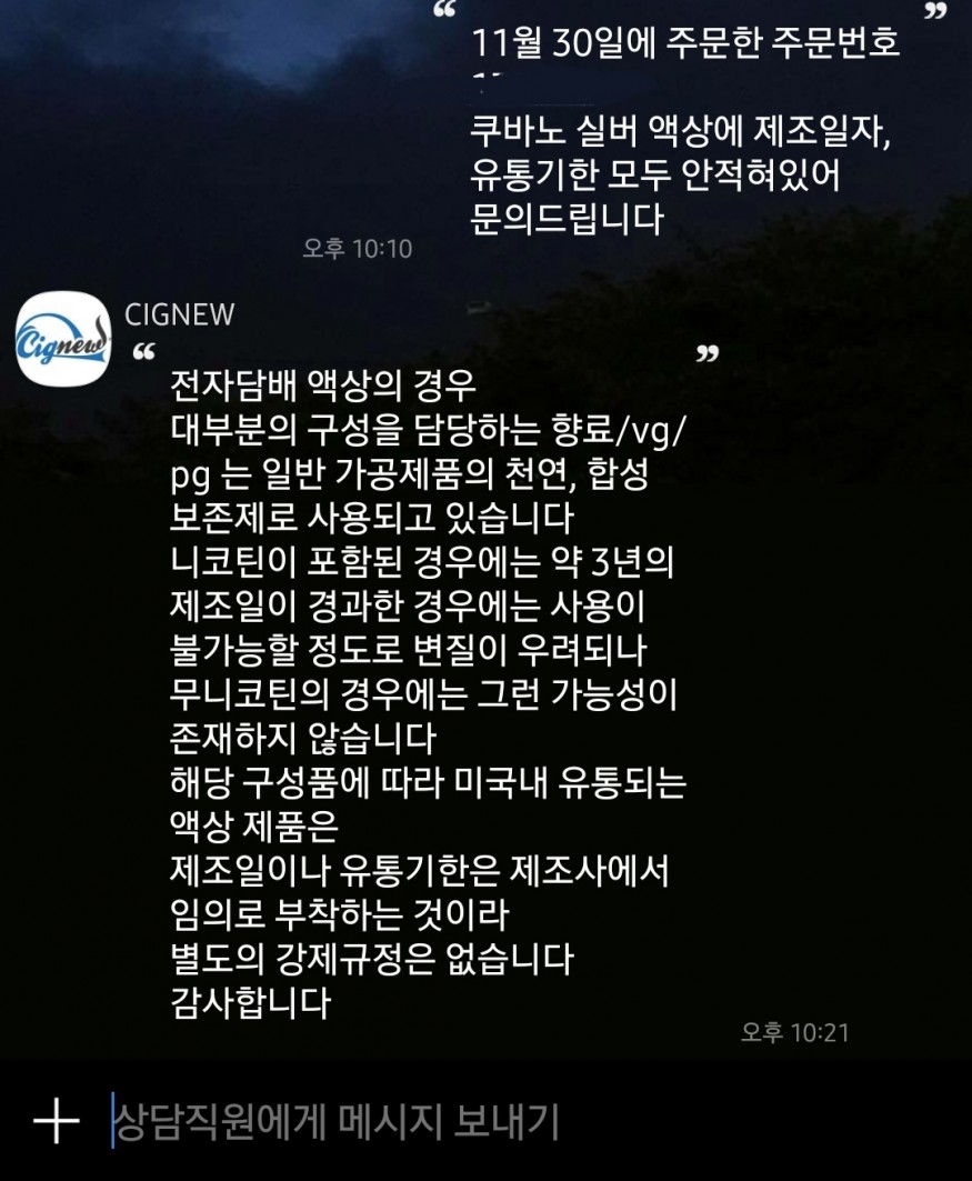그게 오늘 도착했는데 액상 상자나 병에 유통기한이나 제조일자가 적혀있지 않아서 문의 넣었더니 이렇게 답변이 왔습니다