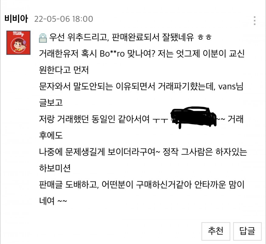 사실 저도 엇그제 비슷한 상황이생겨서 걍 *밟았다 생각하고, 넘어가려고 했는데, 반스님 판매글 댓글버면서 저랑 거래했던 동일유저분이거 같아 확인해보니 맞더라구여~ ㅜㅜ 같이 서로 공유하는 작은 커뮤니티에서 저런 매너는 진짜 아니라고봅니다~~ 반스님 제가 느꼈을때 엄청 천사분이라 이정도로 하시는거라 생각듭니다~ 다른 유저님들도 각별히 주의하시기 바랍니다!! |