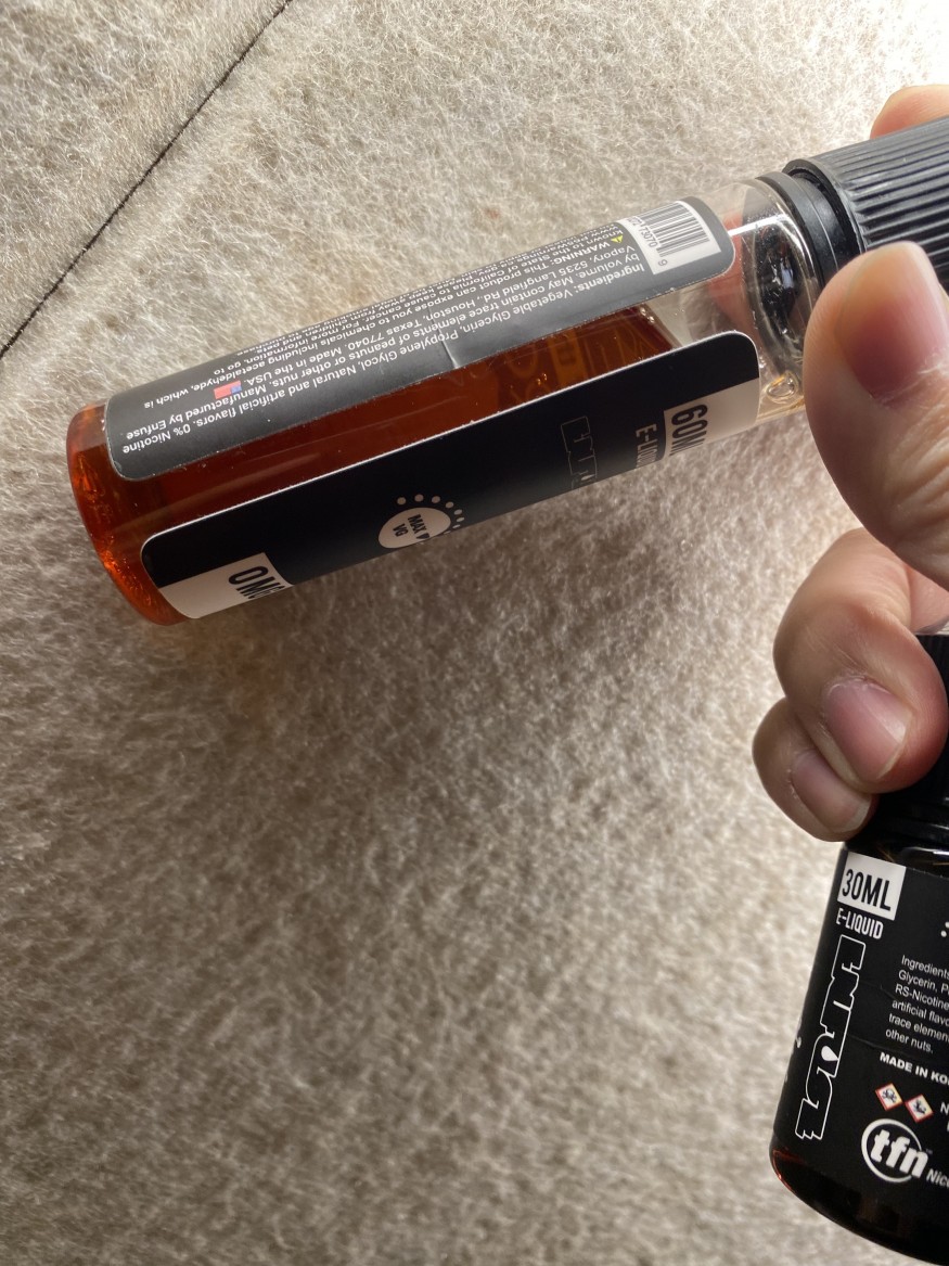 그리고 첫짤의 60ml병에 0mg라고 써 있는데... 무니코틴이면 목넘김도 약하고 폐호흡액상을 입홉으로 하셨으니 향도 약하고... 30ml입홉용 사시면 됩니다. 그런데 요즘 무니코액상을 파나요? |