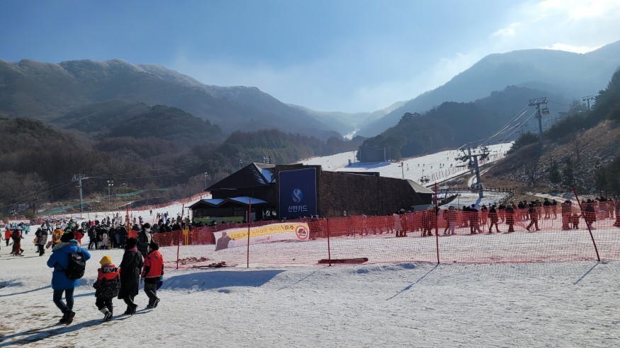 @엘레프슨강습끝내고 자유시간 가지다가 2시 40분쯤 접선해서 쉬고있을 테니 둘이서 한번 타봐라 하고 3중 대기열이었던 설천 에코 단 "1회" 타고 내려온 시간이 4시였습니다. 제수씨가 완전 초보라 스탑워치로 15분 나왔다고 했는데... 줄만 1시간 가량... |