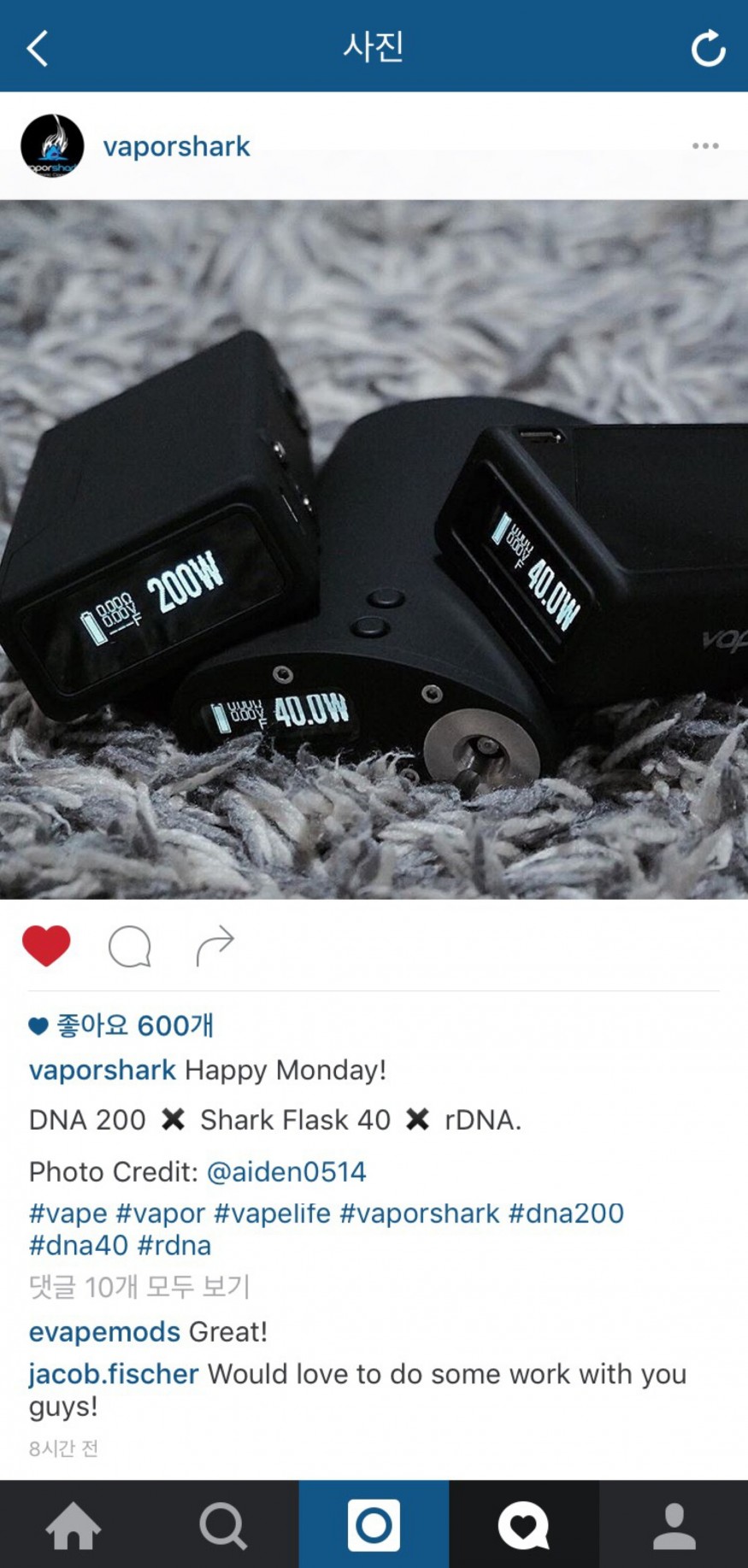 걔네가 타 인스타유저를 팔로잉하고 있는 숫자로 미루어 보건데... 아마 안해줄껍니다ㅋㅋㅋ 저도 그냥 태그에 #vaporshark 를 적었더니 알아서 찾아내더군요!! |