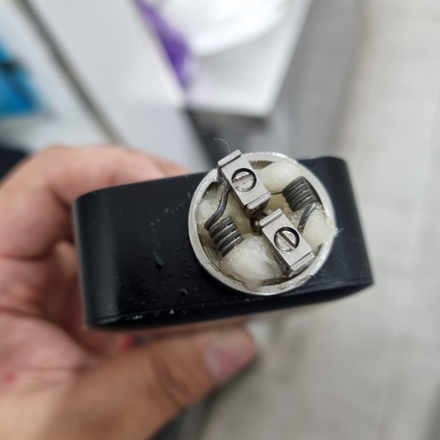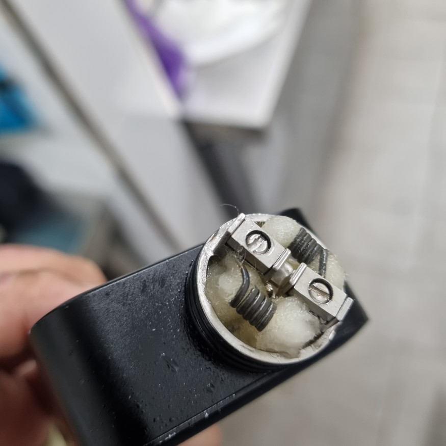 코일에 하단부가 3분에 1일나 하단부밑선이 살짝 보이는 높이로 잡아줘보세요. 사진에서 처럼 코일 밑쪽으로 가는 솜은 양쪽으로 벌려주는것이 좋습니다. (되도록 코일 밑쪽에 솜이 없게끔. 코일겉면을 따라 공기가 이동한다 생각하시면 됩니다.) 그리고 리빌드에 대한 약간에 과장? 환상? 같은것이 있습니다. 액상이 개취이듯 기성매쉬코일보다 못할수도 있습니다. |