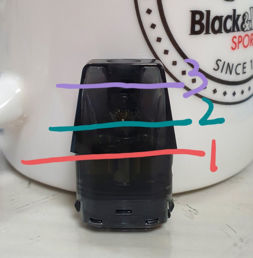 1번까지만 채우셨다는거보니까 그런 생각이 드네요 검은색밑으로 액상이 내려가면 안됐을꺼에요 1번줄 밑에 코일에 액상들어가는 구멍 보이시죠?? 그 구멍밑으로만 액상이 내려가지않게 주의해주시고 3번까지 꽉꽉 채워서 베이핑하세요 |