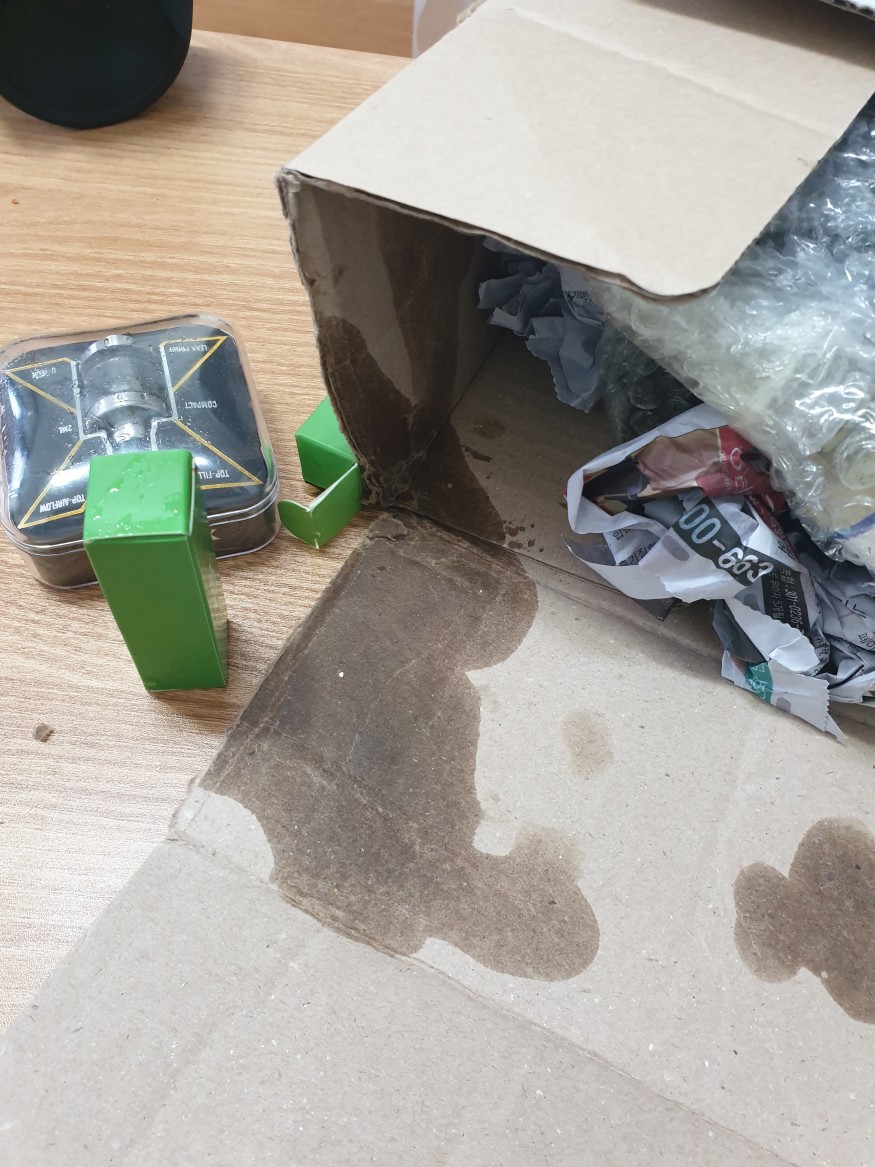 설마..했는데 액상이 깨져서 배터리 및 박스들이 다 젖어있네요