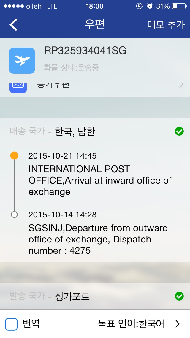 2015-10-21 08:12GIMHAE, Arrival at delivery office 2015-10-21 07:16GIMHAE 2015-10-21 07:07BUSAN MAIL CENTER 2015-10-21 04:37BUSAN MAIL CENTER 2015-10-21 01:13대전교환센터 2015-10-20 22:20대전교환센터 2015-10-20 18:54INTERNATIONAL POST OFFICE 2015-10-20 14:38INTERNATIONAL POST OFFICE, Arrival at inward office of exchange 추적하면 대충 이런 순서로 되네요.. |