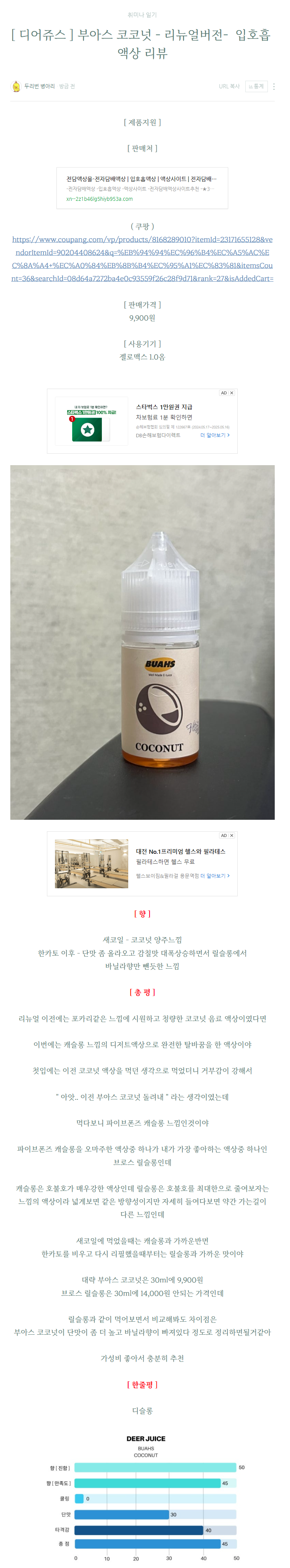 [ 디어쥬스 ] 부아스 코코넛 - 리뉴얼버전 - 입호흡액상 리뷰