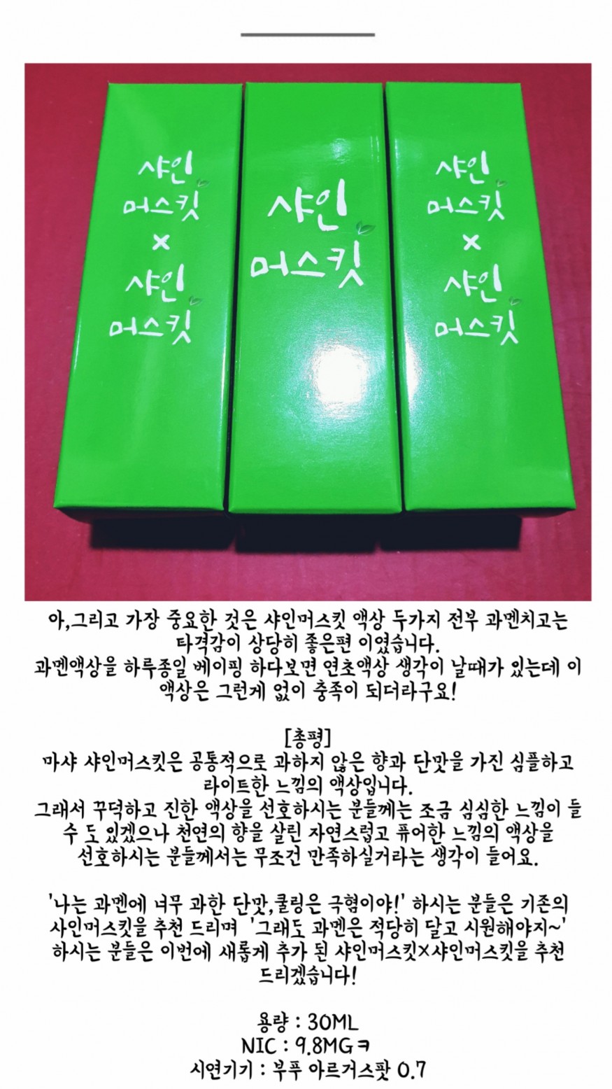 제가 사실 요즘 너무 달고 자극적인 액상에 익숙해져 있었는지 처음 먹었을땐 뭔가 조금 약하다는 느낌이 들었는데 그게 또 마샤 액상만의 매력인 것 같습니다.