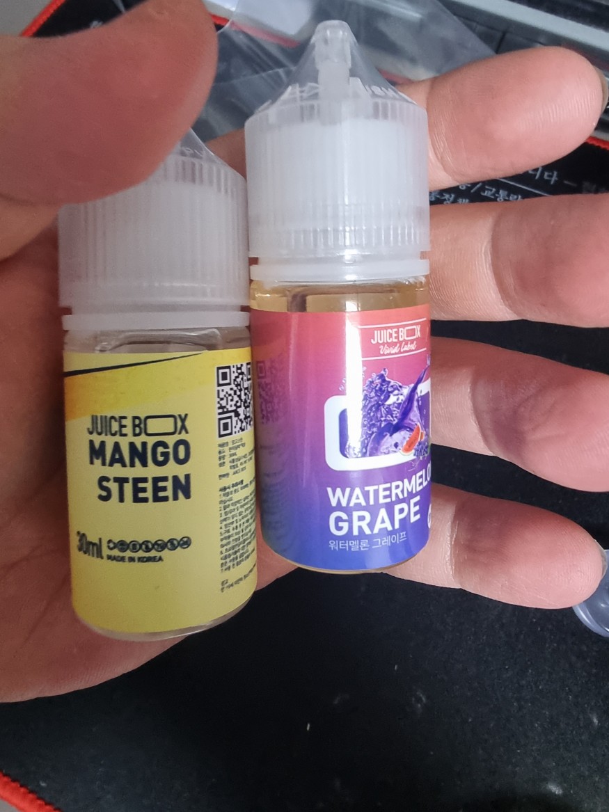 처음에 액상 뚜껑을 열었을때 나는 향은 진한 수박향 뒤에 은은한 포도향 딱 생각하는 그대로 입니다 수박바와 하이츄 포도맛 합친 느낌이 들더군요 처음에 받자마자 오지게 흡입해서 지금 니코뽕을 느끼면서 3카토를 해치웠는데..... 와..... 이거 데일리로 먹으면 맛나겠다..... 진자 쿨링 적당하고 단맛이.... 제가 김장 담근 액상중에 스위트너 14미리 때려박은 거와 비슷한 단맛이 납니다 액상 자체가 달달해서 질릴 위험이 있다고들 생각하시겠지만 쨍한 단맛이 아니라 여유롭게 베이핑할때 나는 은은한 단맛이 납니다 신기합니다 당도는 비슷한데 이런 단맛 나기 힘든걸로 알고 있거든요......