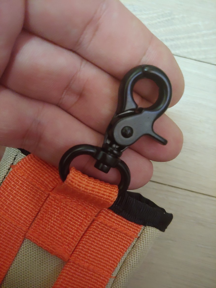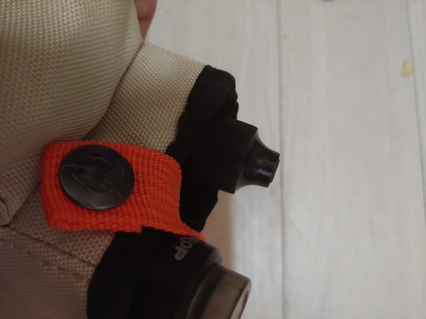 메인 파우치는 큼지막한 두발이 들어가는 싸이즈 이고 안감은 역시 네오프린 입니다. 스크래치 잘 안나죠. 저는 덥배를 넣었고 공간이 살짝 남아 내스티쥬스 10미리 공병을 옆에 더 넣었습니다. 고무줄로 잡아주는게 없는 대신에 밴드가 무화기 부분을 감아 단추로 잠그는 방식입니다.. 주황색이라 드랍 맷블랙이랑 어울리네요.